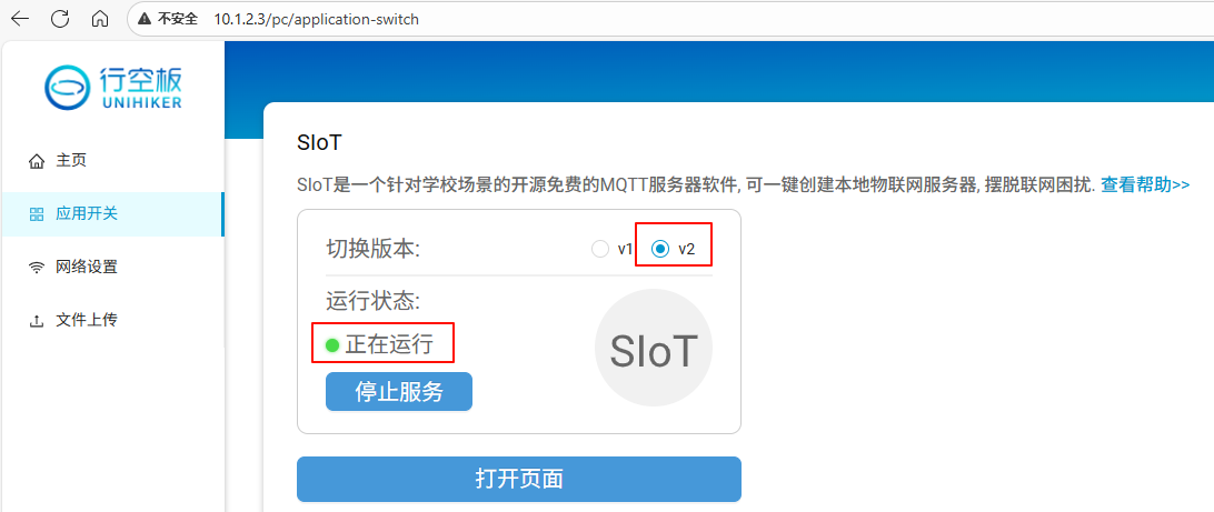 行空板上系统版本如果在v0.4.0及以上,则可以检查在本地web网页菜单中确保切换到了SIoT V2:
