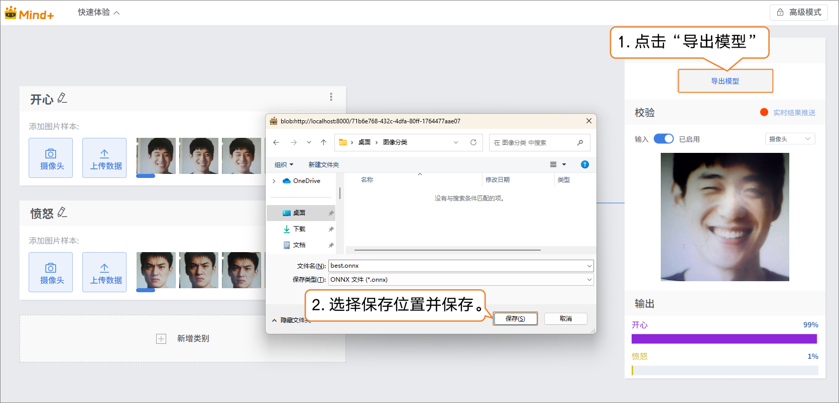 - 当模型的校验结果符合预期后,即可导出模型文件(模型文件以2. 快速开始中的模型为例)。点击“导出模型”将模型导出为ONNX格式的文件和yaml格式的配置文件,选择保存位置并完成模型文件导出。