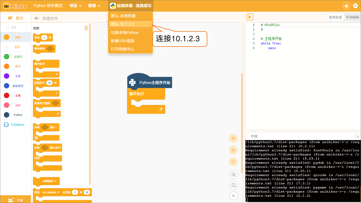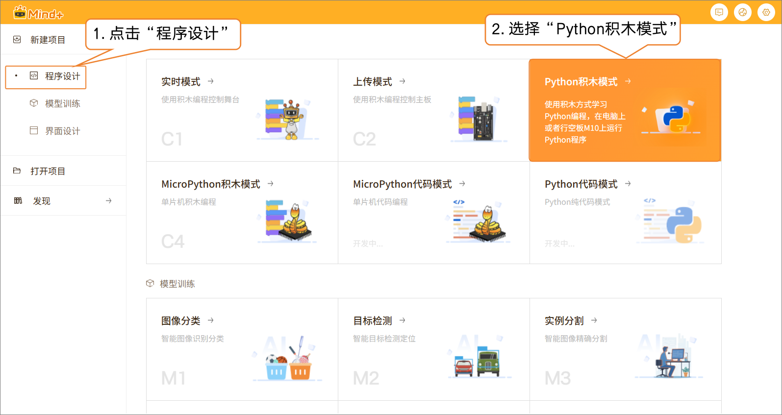 - 新建程序设计项目:在程序设计中,选择“Python积木模式”。
