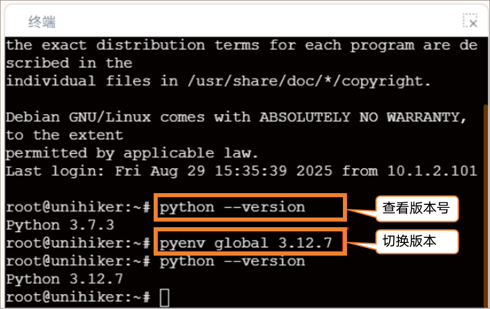 - 切换Python版本:在终端中输入“python --version”后按“回车键”以检查行空板M10的python环境版本。如果不是指定版本3.12.7,在终端输入“pyenv global 3.12.7”以切换为该版本。