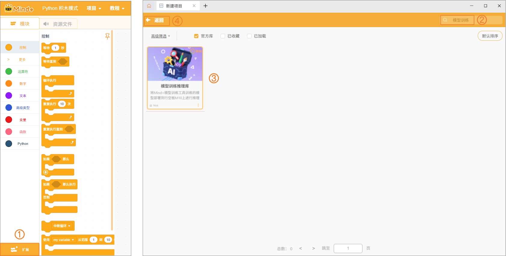 - 添加模型训练用户库:点击"扩展",在搜索框中输入"模型训练",点击扩展库上的"下载"按钮。下载完成后,点击扩展包完成加载,最后点击"返回",返回编程界面。