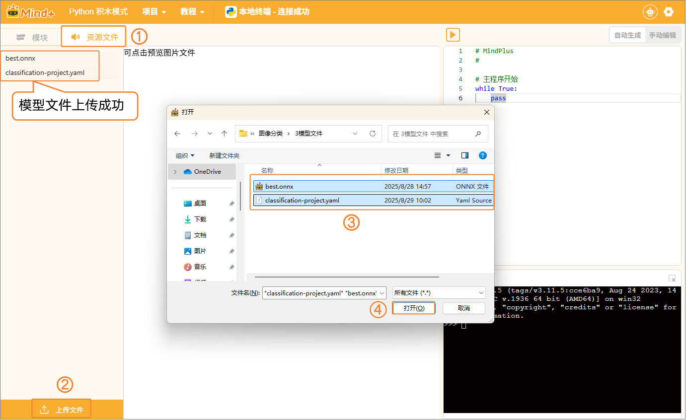 - 本地推理:在目标设备(如行空板 M10)上直接运行模型,对摄像头或传感器数据进行实时推理。