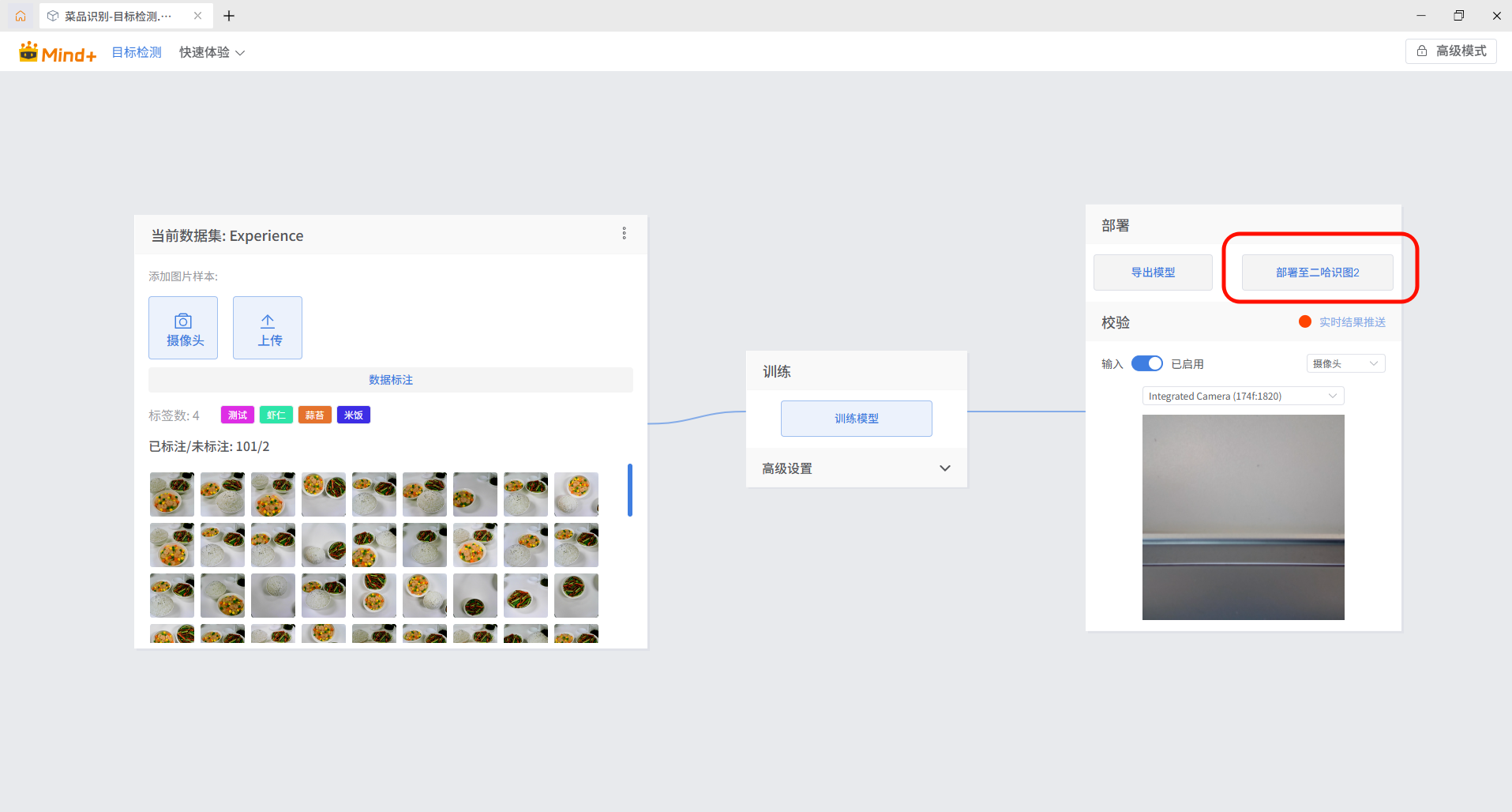 模型部署是将训练完成并验证效果的模型,从AI工具箱导出并运行在目标硬件上,实现模型推理应用。通过部署,模型可以对摄像头或传感器采集的数据进行实时推理,生成识别结果,用于驱动硬件设备或智能交互系统,实现AI识别功能的实际应用落地。