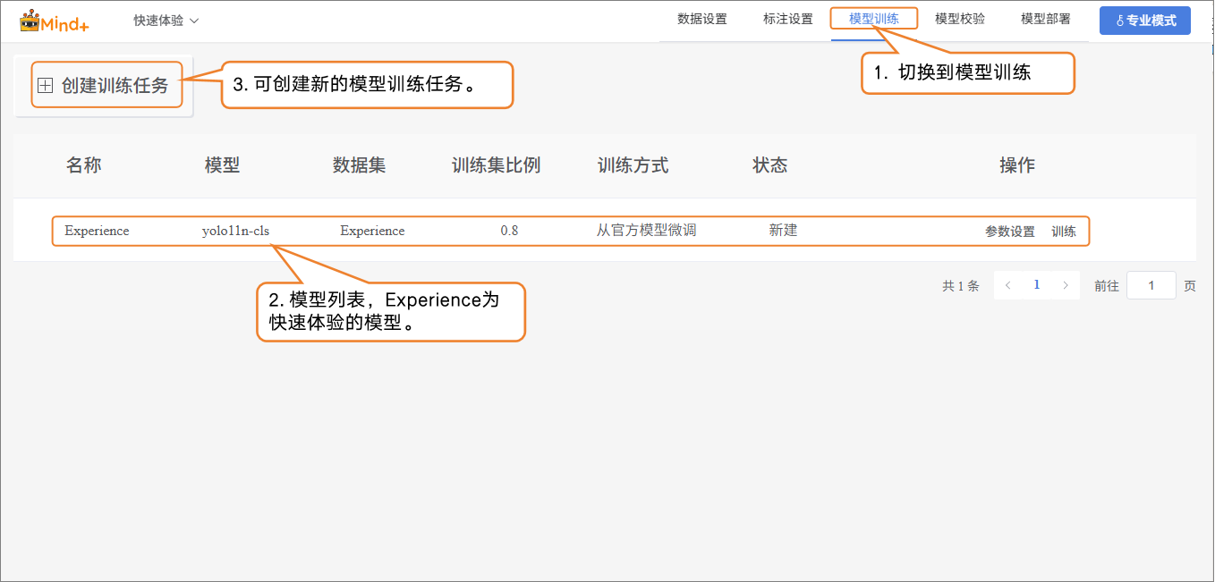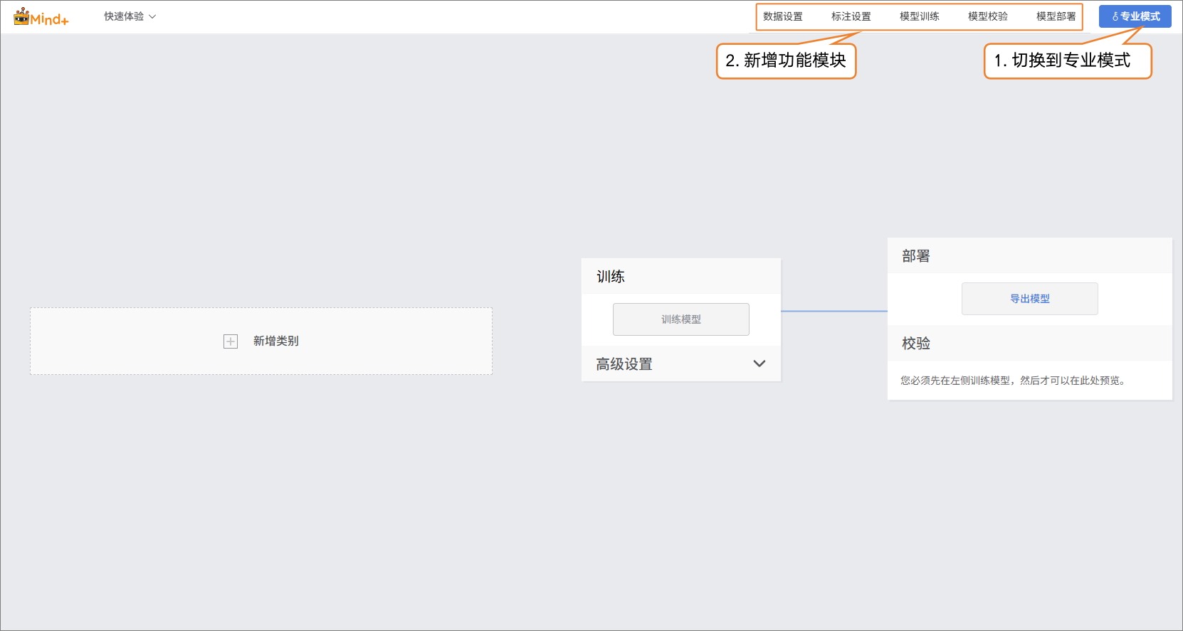 - 在界面右上角点击 “专业模式” 以切换模式。切换成功后,菜单栏将新增以下功能模块:数据设置、标注设置、模型训练、模型校验和模型部署。
