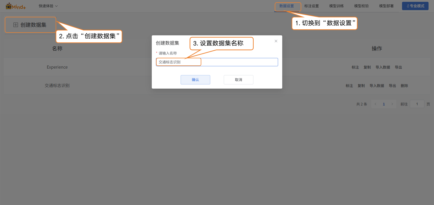 - 切换到 “数据设置” → 点击左上角 “创建数据集”,例如创建一个名为交通标志识别的数据集。