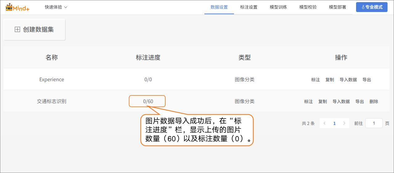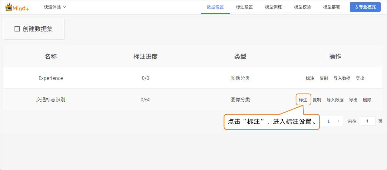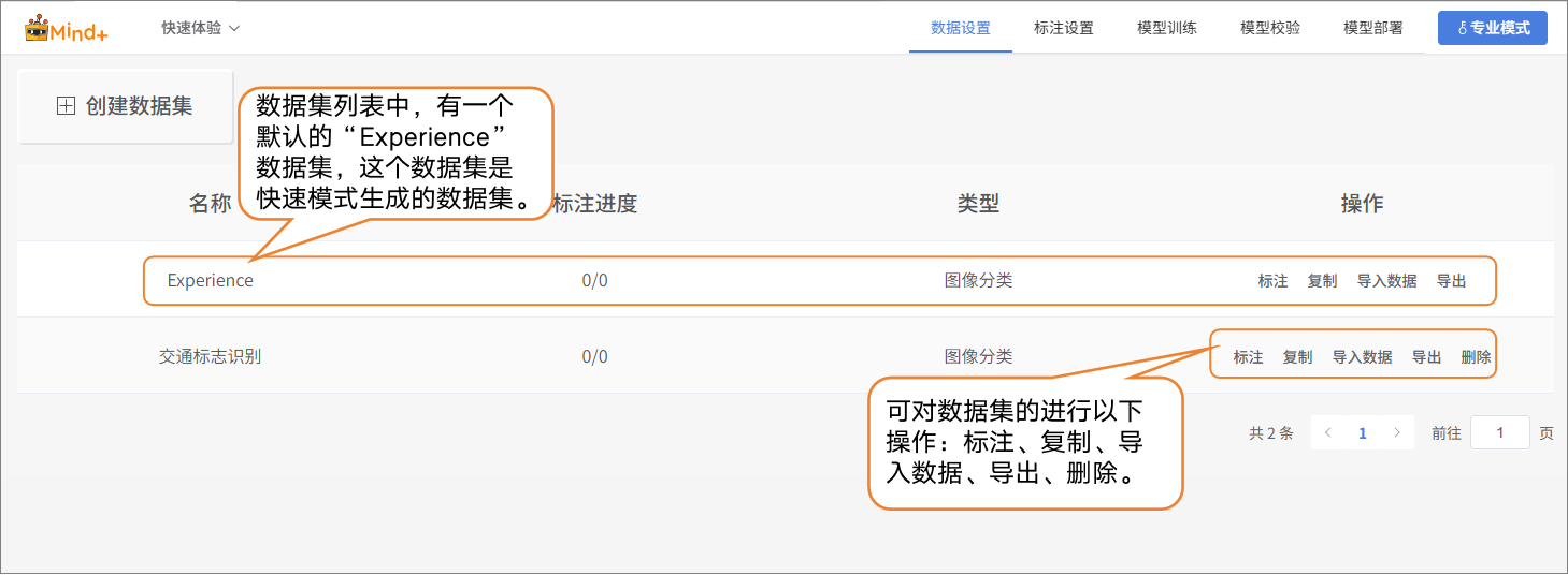 - 切换到专业模式后,数据集列表中会默认显示一个 “Experience” 数据集,该数据集由快速体验模式生成。用户可以对新建数据集执行以下操作:标注、复制、导入数据、导出以及删除。