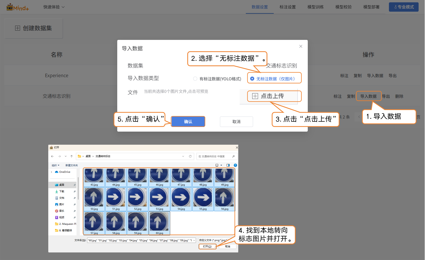 - 操作步骤:选择导入类型为 “无标注数据” → 点击 “点击上传” → 从本地选择图片 → 点击“确认”完成导入。