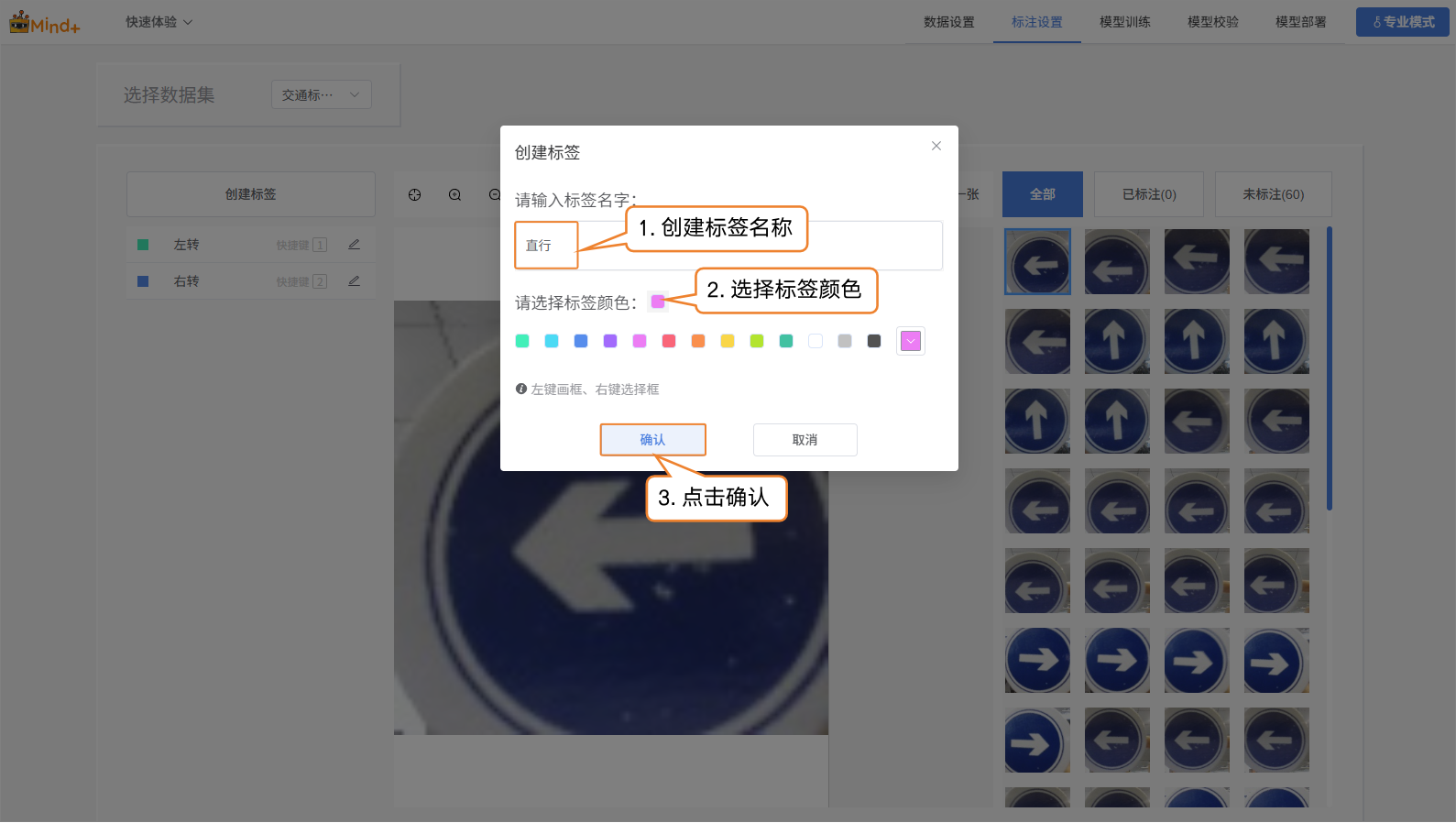 - 按照界面提示完成标签创建(左转、右转、直行),用于标注不同类别的交通标志。