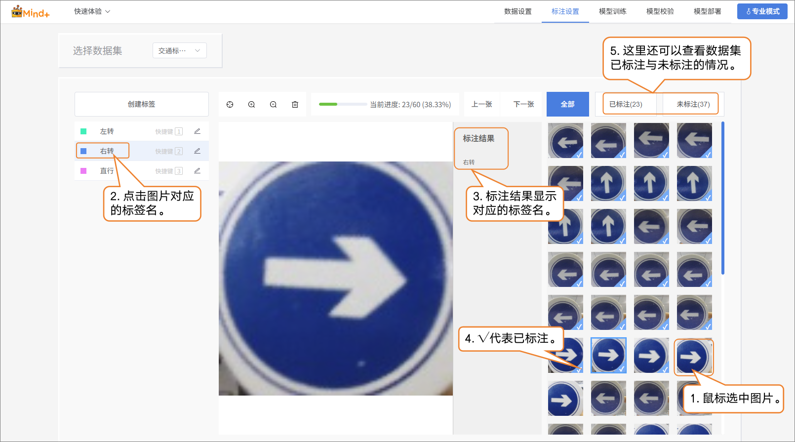 - 转向标志图片导入成功后,标注进度栏会同步显示已导入的图片数量及对应的标注数量。