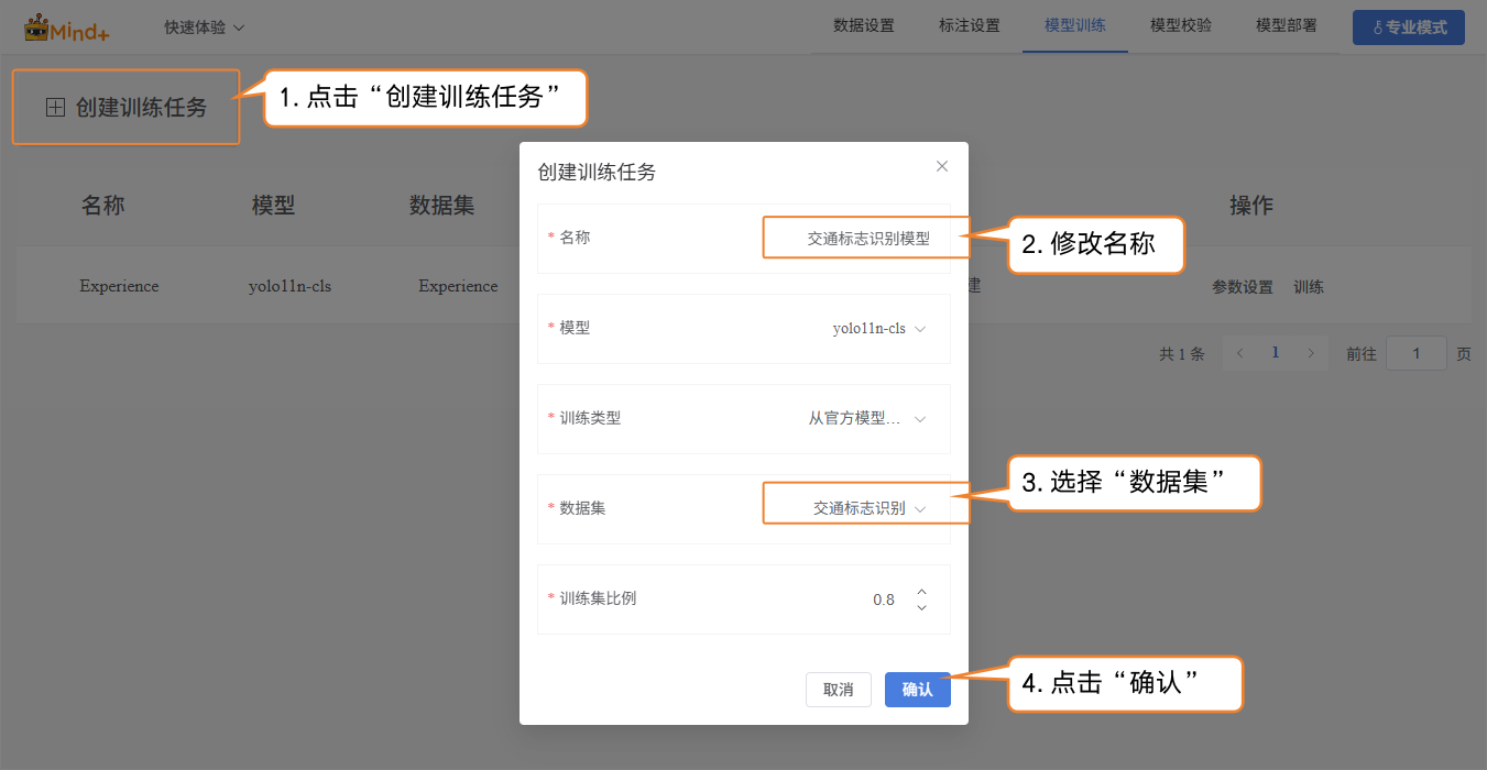 - 数据集:交通标志识别(在数据设置中,我们已创建并命名数据集 交通标志识别;在标注设置中,也完成了图片的标注与整理。至此,数据已具备训练所需的完整结构。接下来进入模型训练阶段,系统将基于该数据集对图片进行特征提取与模式学习,从而逐步具备对转向标志进行分类识别的能力。所以,这里的数据集必须选择交通标志识别。)