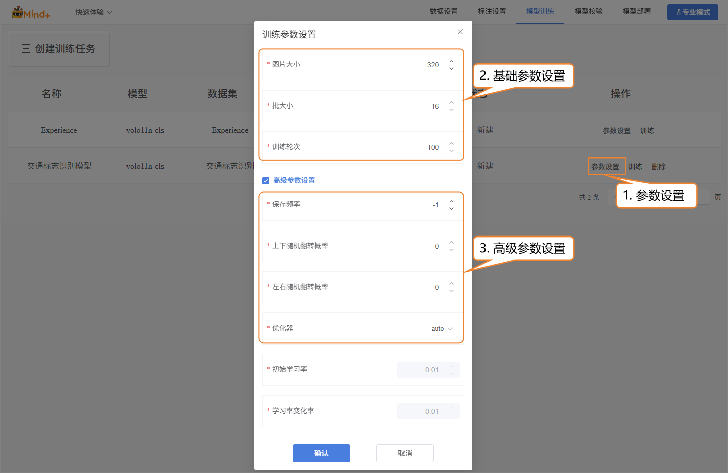 - 高级参数设置:保存频率、随机上下翻转概率、随机左右翻转概率、优化器等