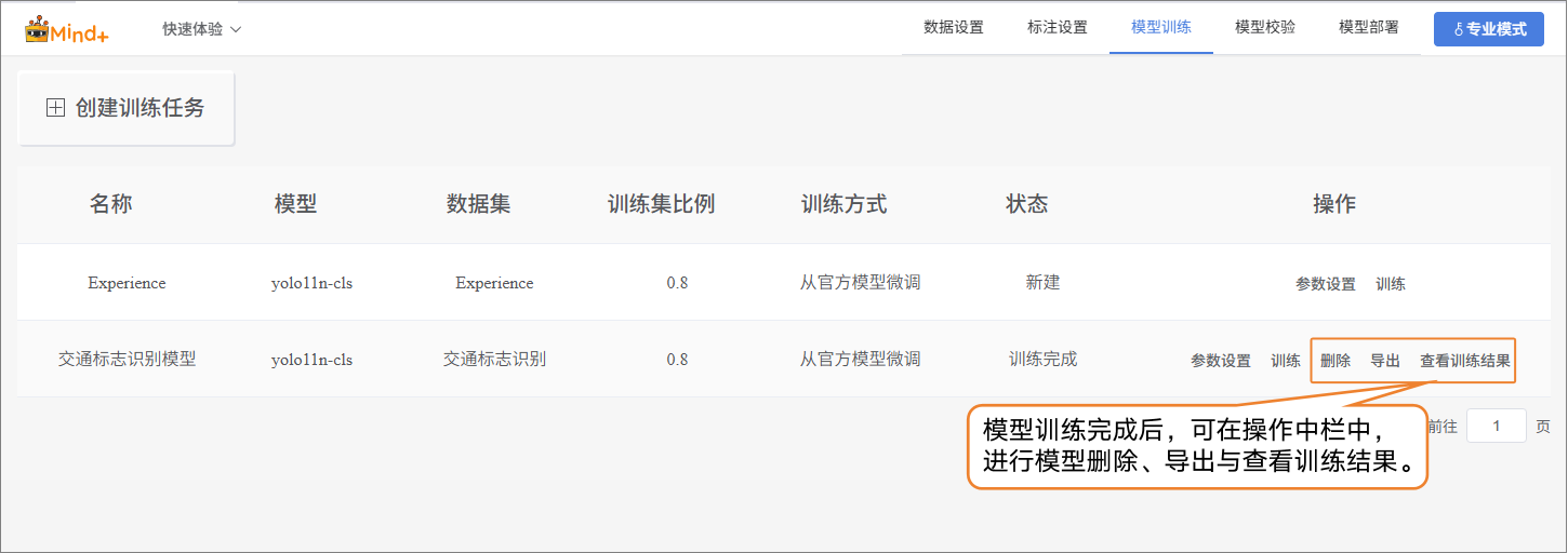 - 模型训练完成后,可在操作栏对已训练的模型执行删除、导出和查看训练结果等操作。