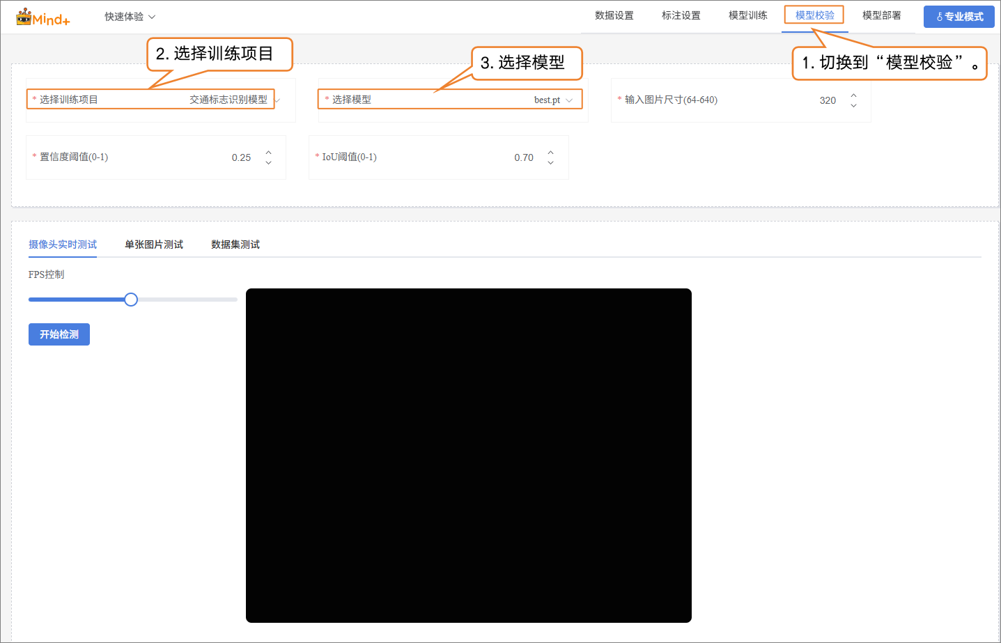 - 模型校验支持两种方式: 摄像头实时测试、单张图片测试。