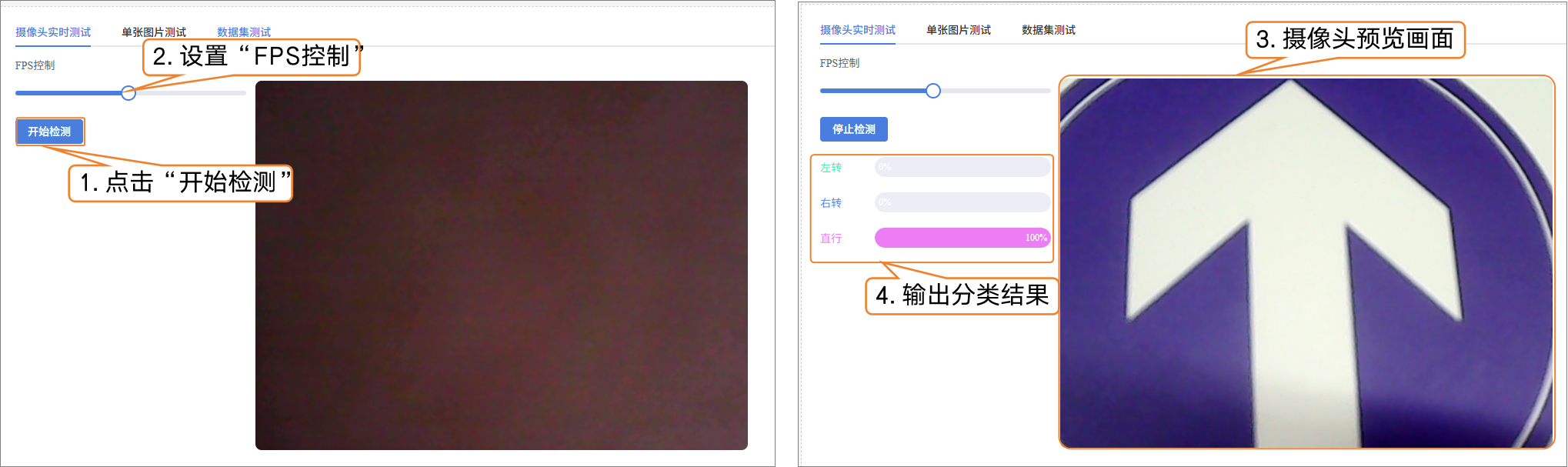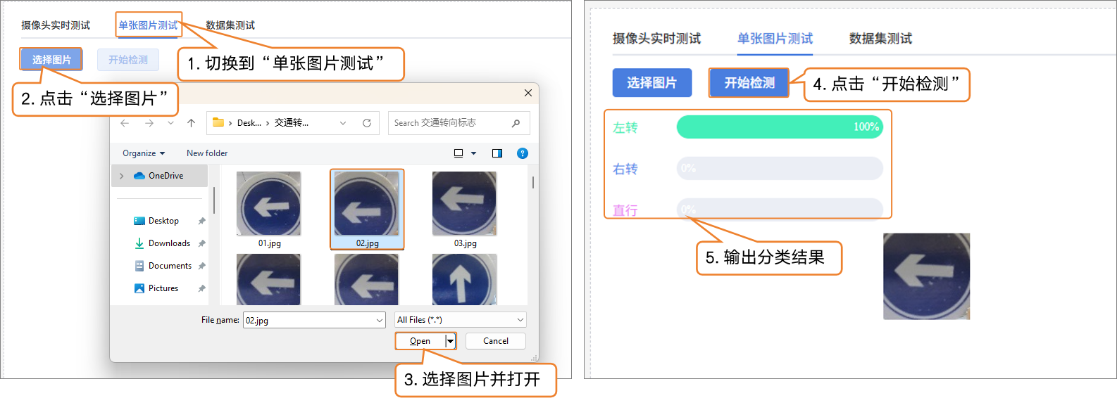- 摄像头实时测试: 通过摄像头实时识别转向标志。