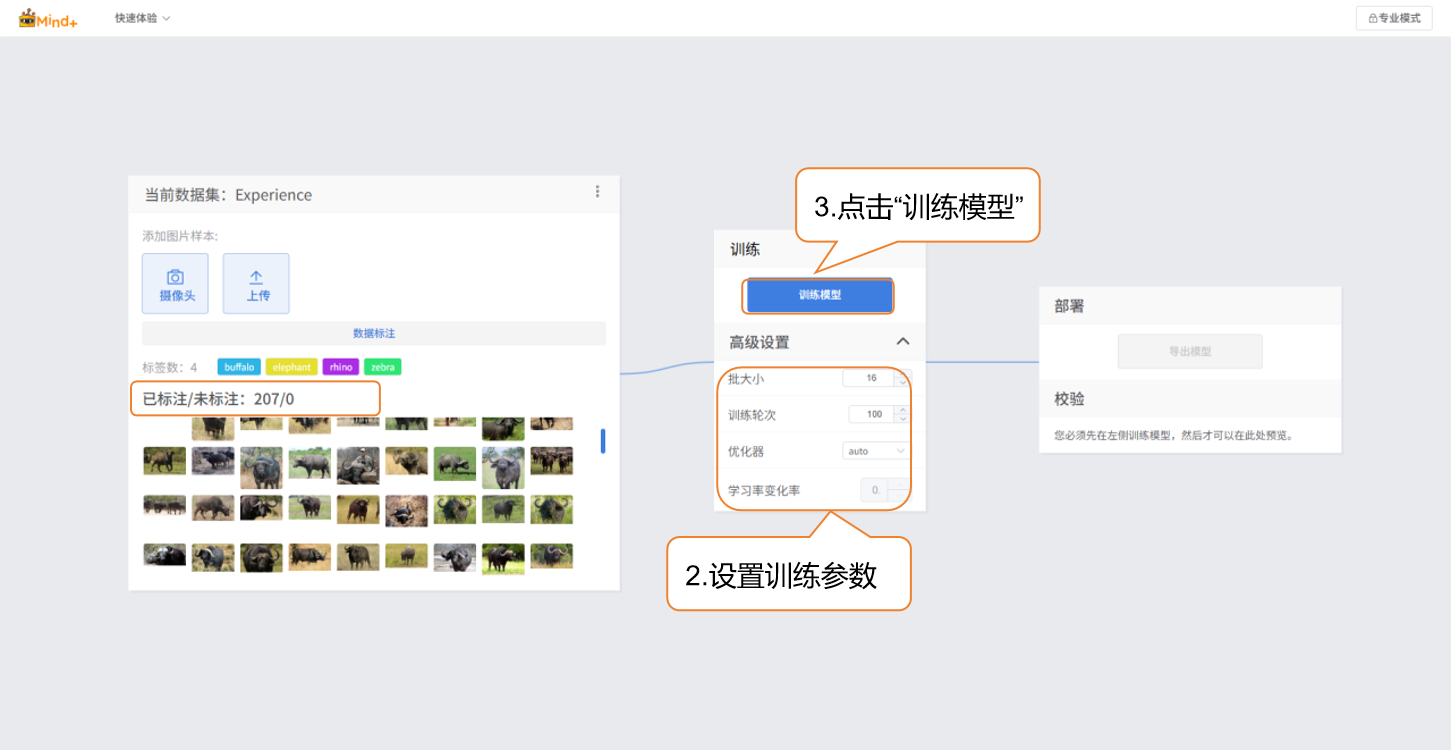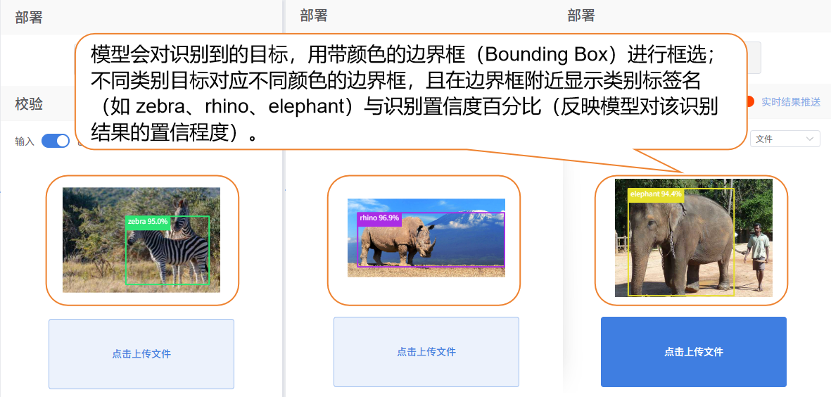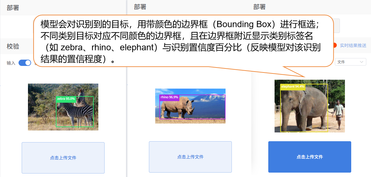 目标检测的快速体验操作步骤以 “野生动物检测(如斑马、大象)” 为例,带领用户学习目标检测模型的训练流程。该案例主要演示目标检测在实际应用中的效果:模型不仅能够识别图片中的斑马或大象等目标类别,还能为每一个目标生成边界框(Bounding Box),准确标出物体的位置范围。通过这种方式,用户可直观看到模型对图中每个对象的独立识别与定位结果,从而理解目标检测与普通图像分类(仅识别类别,无位置信息)的区别,并感受其在现实场景(如智能分拣、安防监控)中的应用价值。