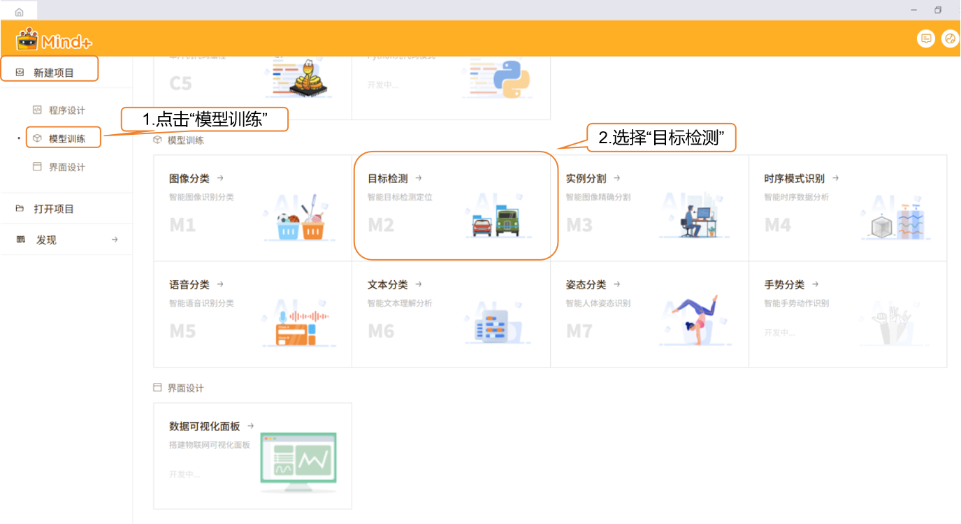 - 打开 Mind+,在菜单栏中选择 “新建项目”,然后点击 “模型训练”。在训练选项中找到 “目标检测(M2)” 并点击,即可完成项目创建。