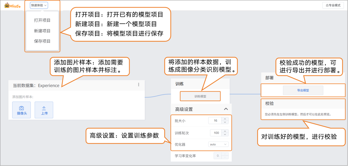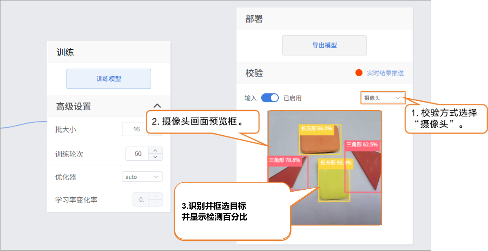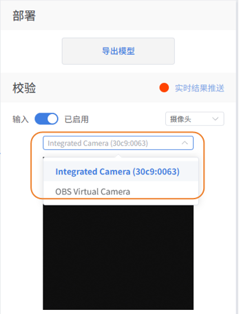 - 模型训练完成后,可以通过校验区,检验模型效果。校验的方式分为两种:摄像头、文件。