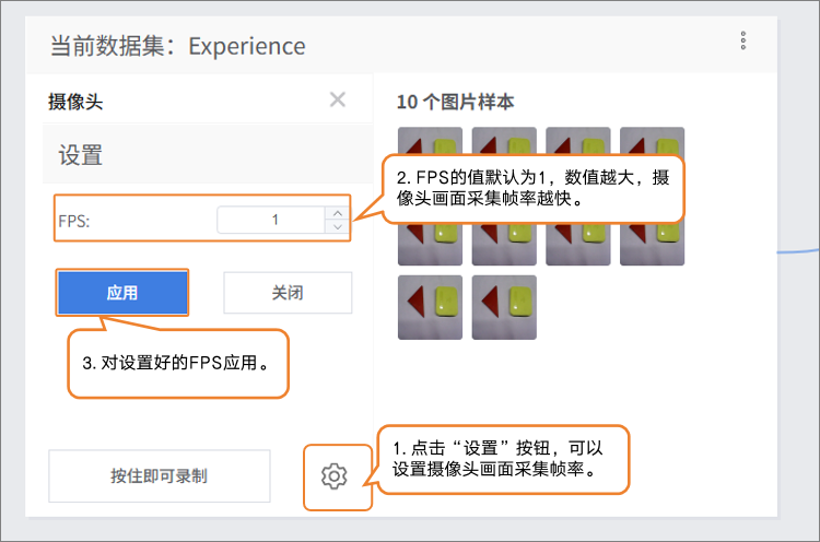 在采集样本数据时,可通过“设置”按钮,设置摄像头的采集帧率(每秒采集的图片数,数值越高采集越快)。