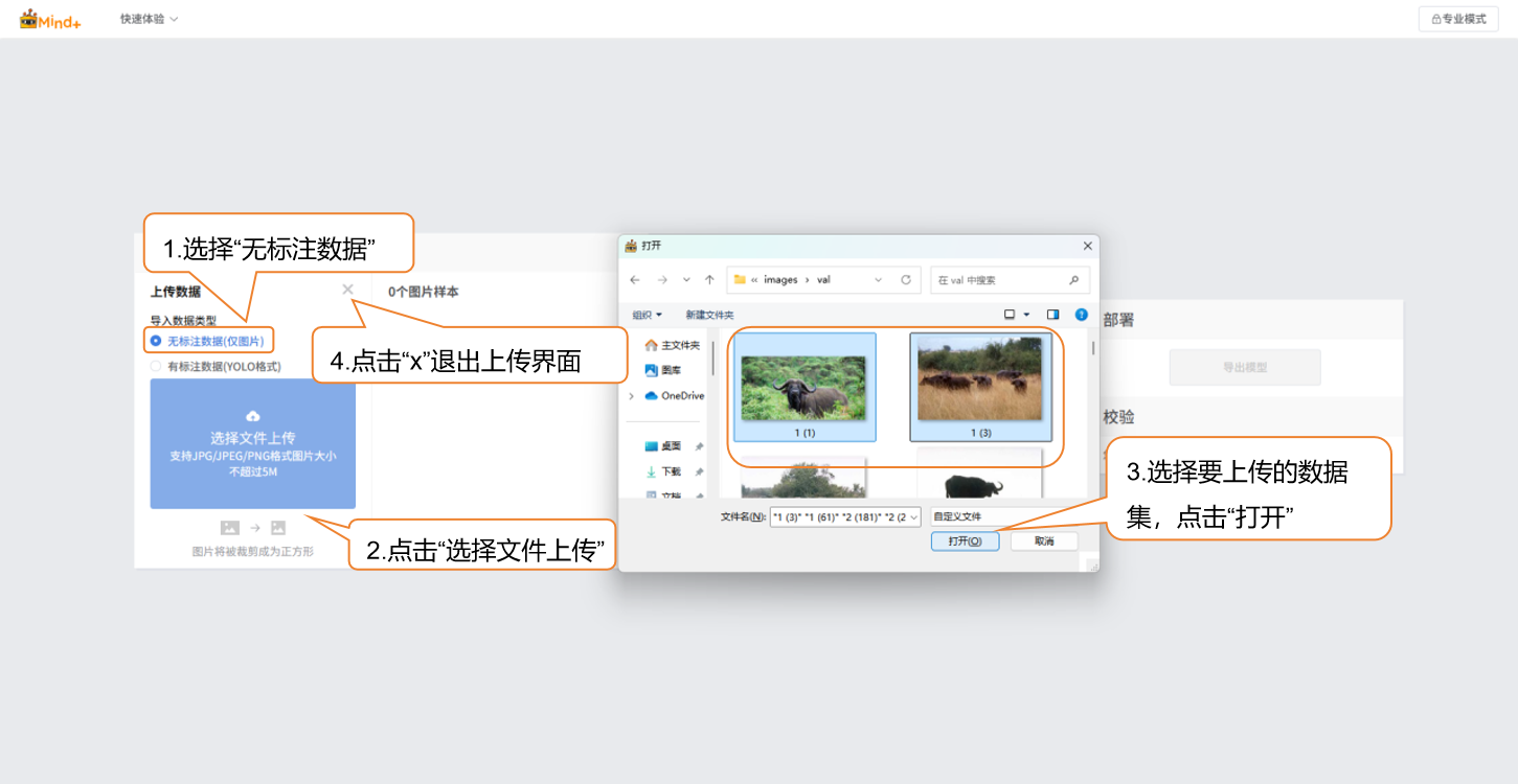 - 无标注数据:仅上传图片样本,后续需要手动对图中目标进行标注。