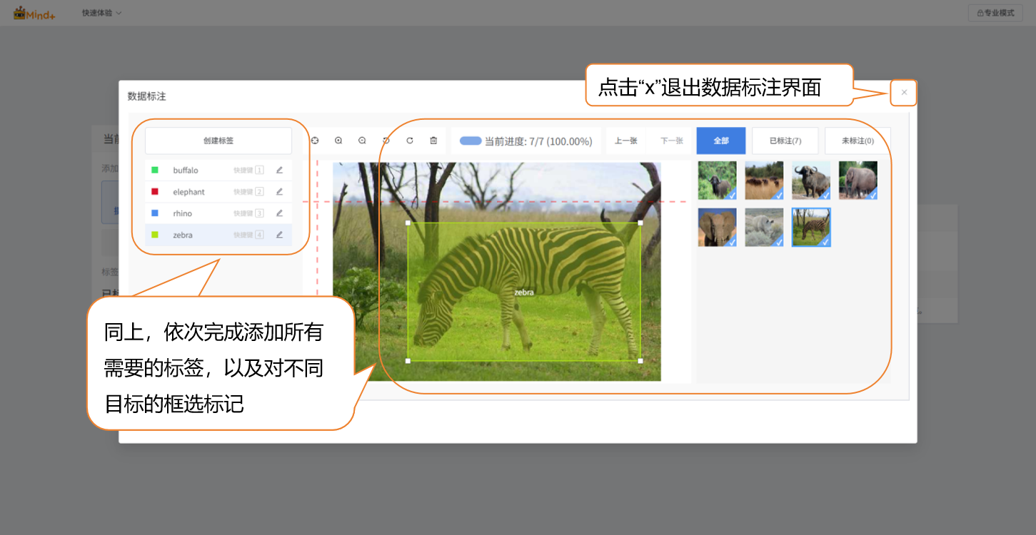 - 同上,依次完成添加所有需要的标签,以及对不同目标的框选标记 - 点击“x”退出数据标注界面