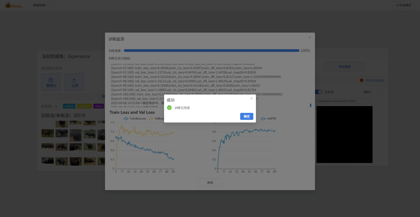 - 完成数据集中所有图片的标注后,设置训练参数,并点击“训练模型”开始训练。