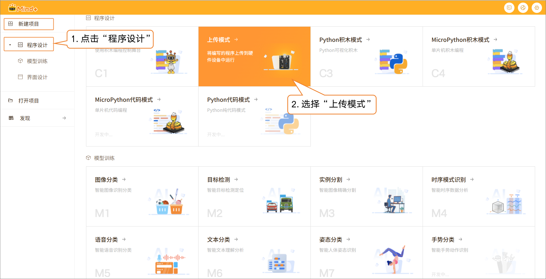 - 打开 Mind+,在菜单栏中选择 “新建项目”,然后点击 “程序设计”,选择“上传模式”并点击,即可完成项目创建。