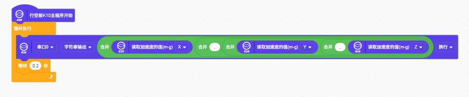 - 利用UNIHIKER K10内置加速度传感器,实时采集三轴数据(x、y、z)。设置采样间隔为0.2s(即 20Hz),并通过串口将加速度数据输出。