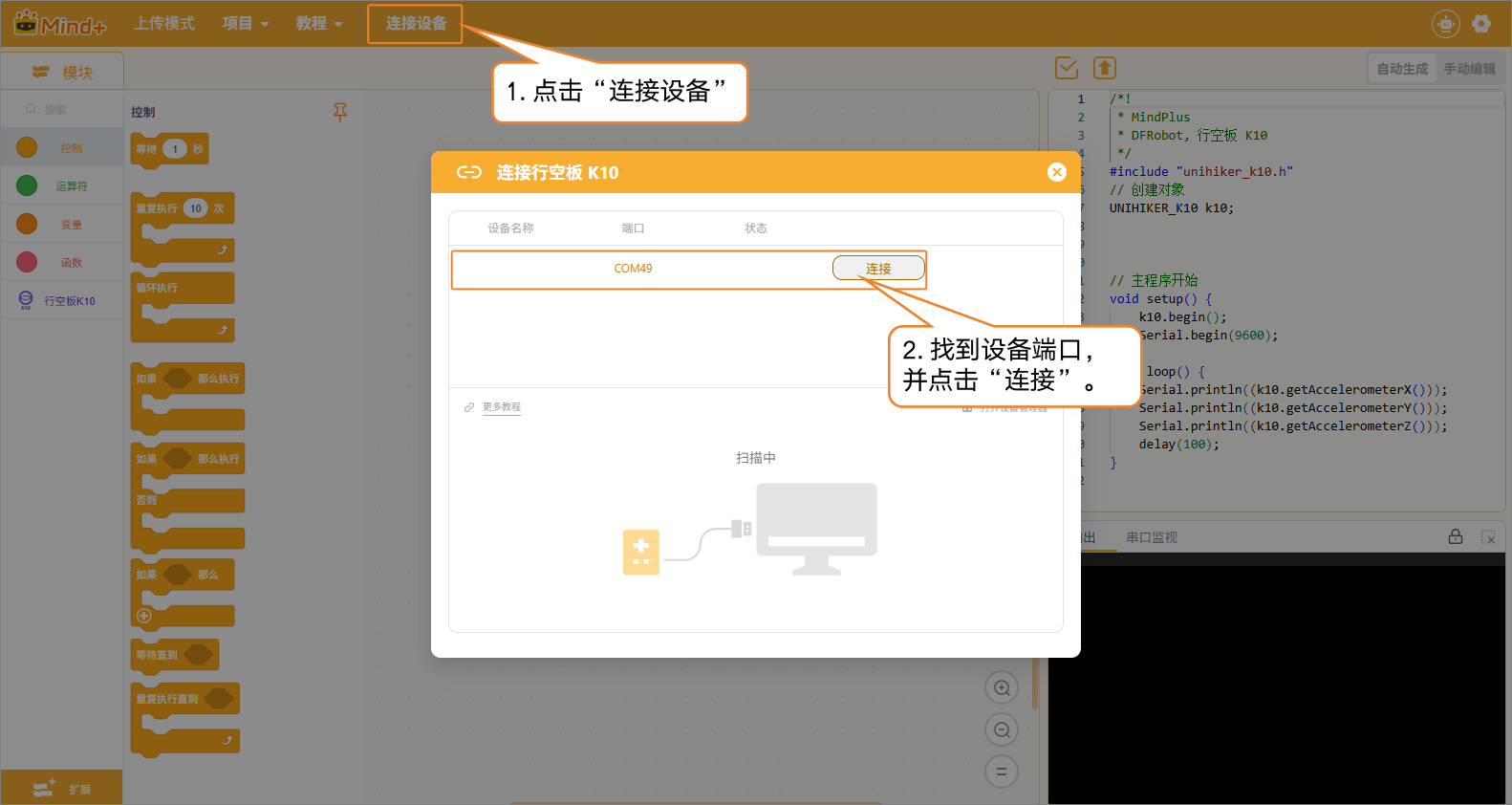 - 点击连接设备,选择识别到的UNIHIKER K10端口并完成连接。