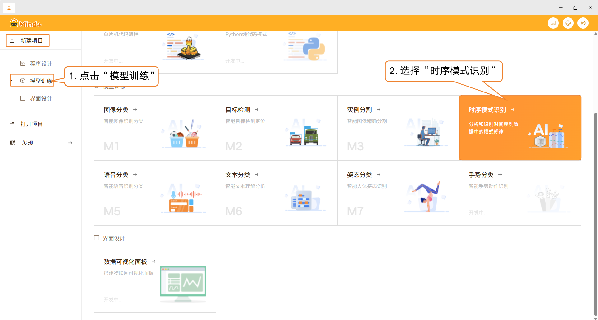 - 点击“首页”图标,返回Mind+首页。在菜单栏中选择 “新建项目”,然后点击 “模型训练”。在训练选项中找到 “时序模式识别(M4)” 并点击,即可完成项目创建。