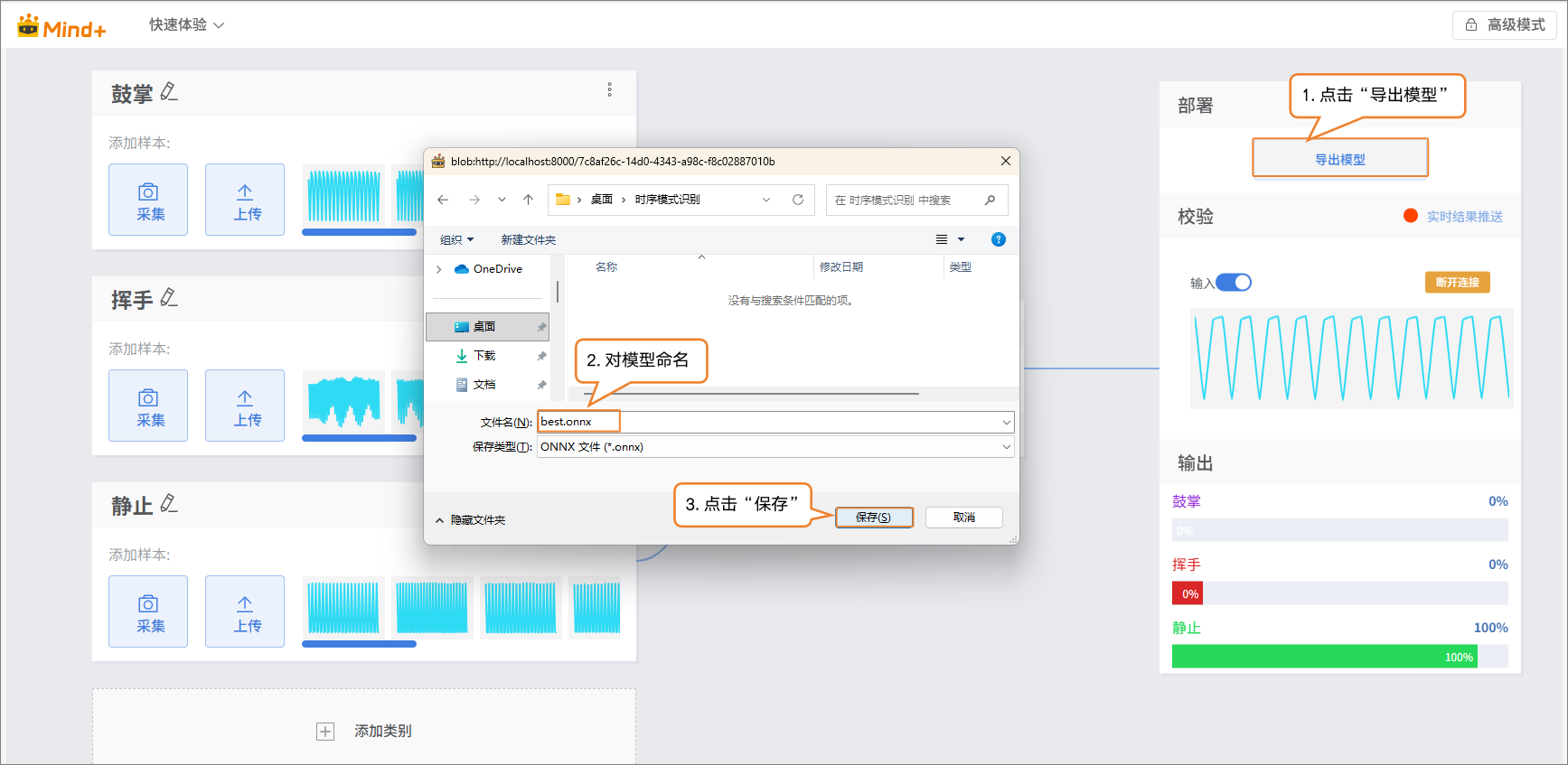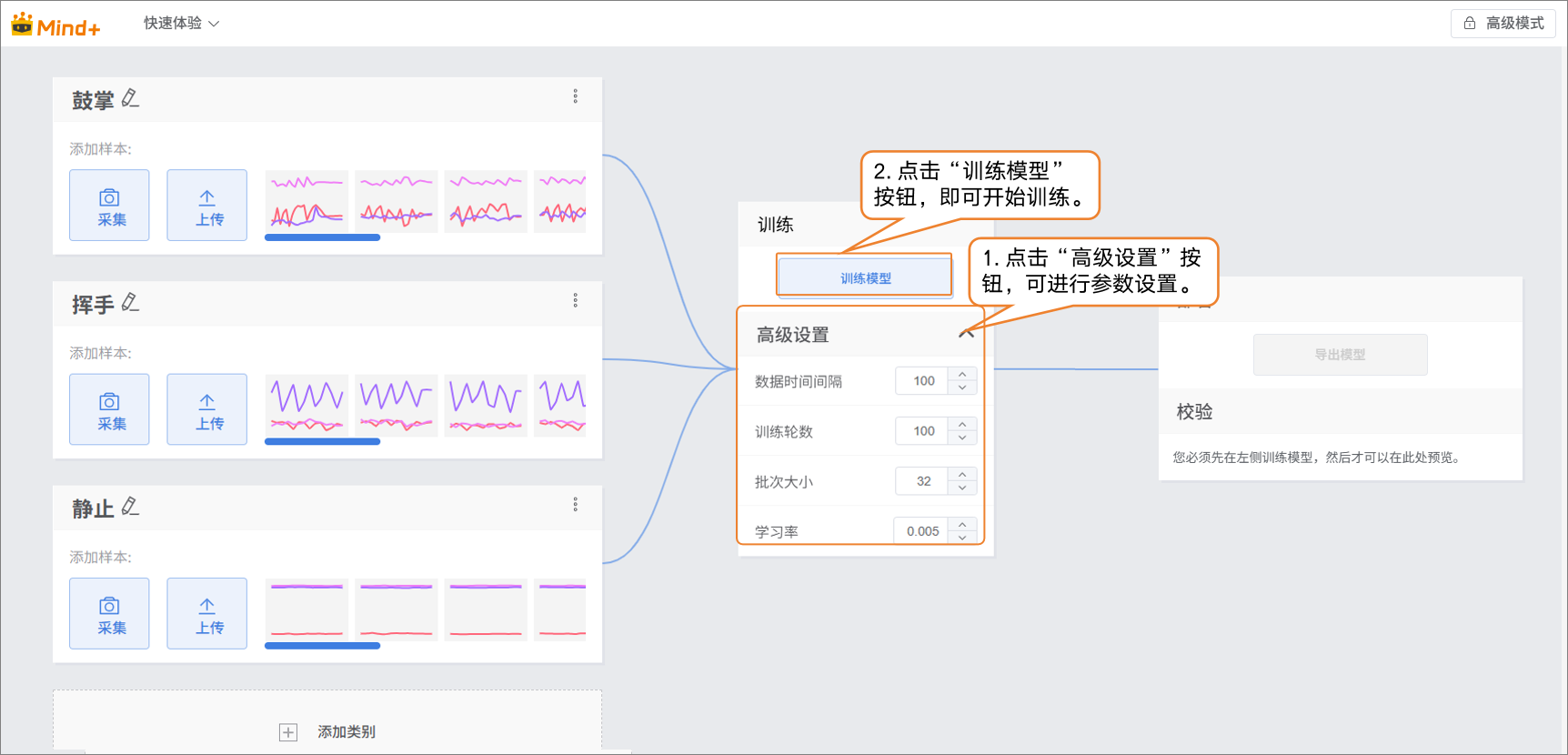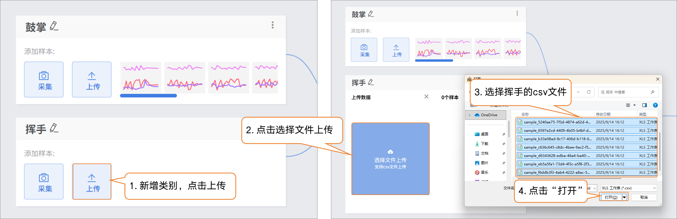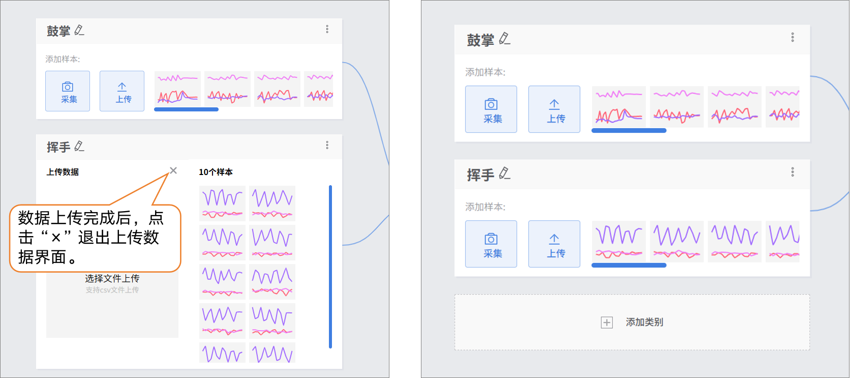 - 点击“添加类别”,新建另一类别(如“挥手”)→ 点击 “上传”,选择电脑本地csv数据批量导入。