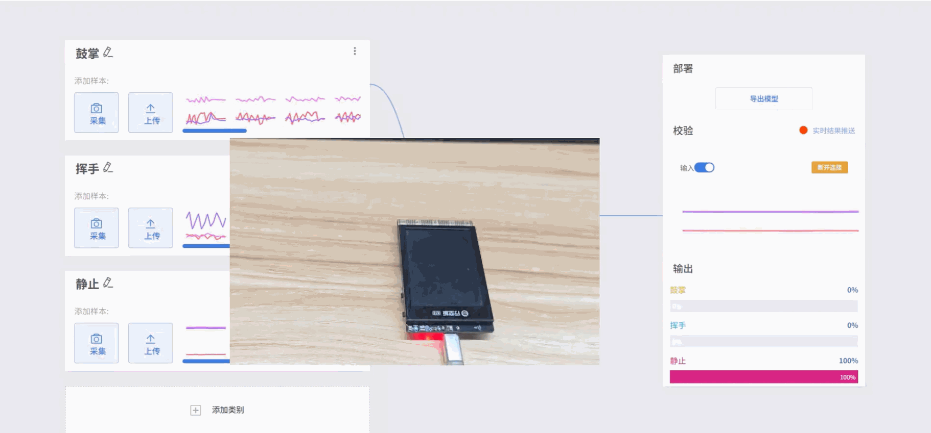 - 模型训练完成后,可在校验区测试模型效果。手持UNIHIKER K10执行动作,观察输出结果是否与实际动作一致,从而判断模型识别的准确性。