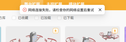 无法下载扩展库怎么办?¶ 问题描述¶ 在添加扩展库时,系统提示"网络连接失败,请检查你的网络设置后重试",导致扩展库无法正常下载和安装。 解决方案¶ 1.确认网络状态 检查电脑是否已连接到互联网 尝试打开浏览器访问其他网站验证网络连通性 确保网络连接稳定,避免使用不稳定的WiFi