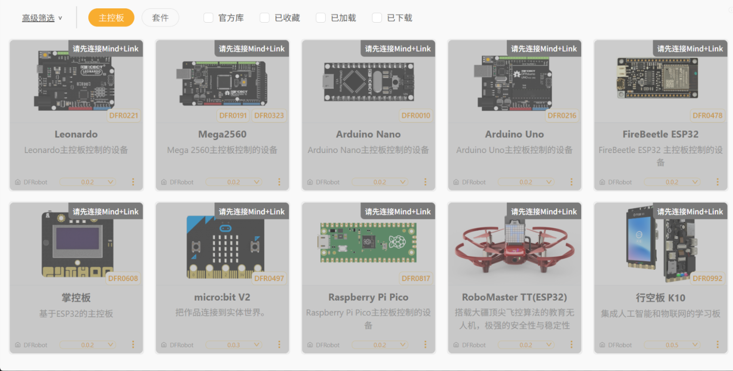 在Mind+ 2.x版本中,打开扩展库,在扩展库卡片右上角都显示“请先连接Mind+Link”怎么办?