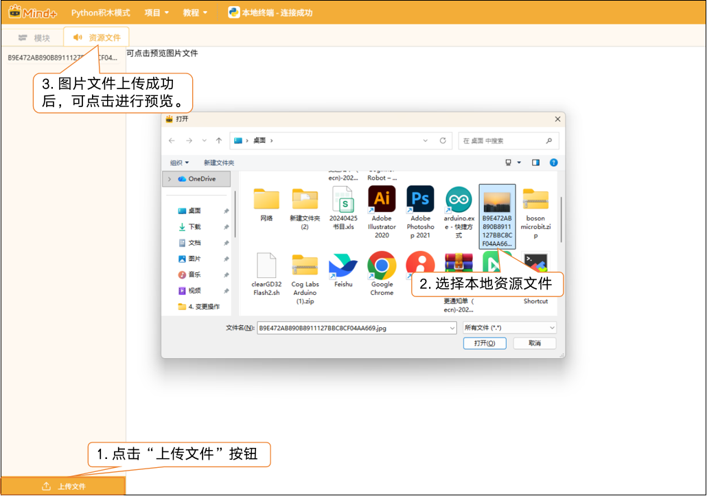点击“上传文件”按钮,可从本地添加所需的资源文件。上传后的图片类资源支持直接预览,方便快速确认内容是否正确。