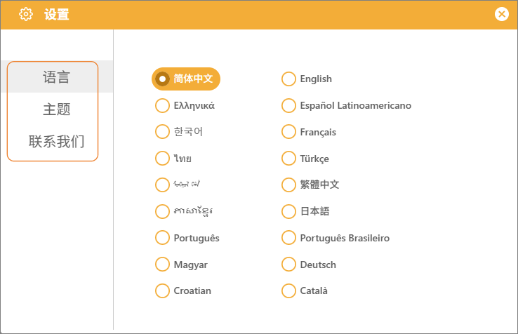 3.3.2 设置 设置界面是 Mind+ 的全局配置入口,点击右上角的“设置”按钮即可打开。该界面在所有程序设计模式中保持一致,支持 18 种语言切换、6 种主题选择,并提供“联系我们”等通用功能。由于内容与实时模式中的设置页面相同,此处不再重复说明,用户可参考实时模式的相关介绍。