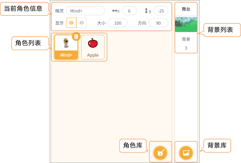 角色及背景区位于舞台区的右下册,用于管理项目中的所有角色和舞台背景。