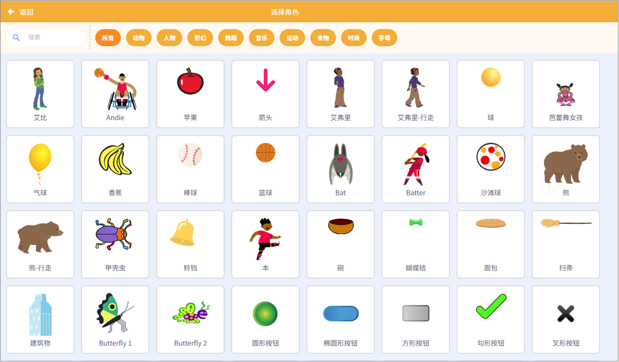 注意: 角色库内置700余种角色资源,按主题分类展示,包括人物、动物、奇幻、舞台、音乐、运动、食物、时尚、字母等多个类别,方便用户快速匹配场景并构建故事内容。
