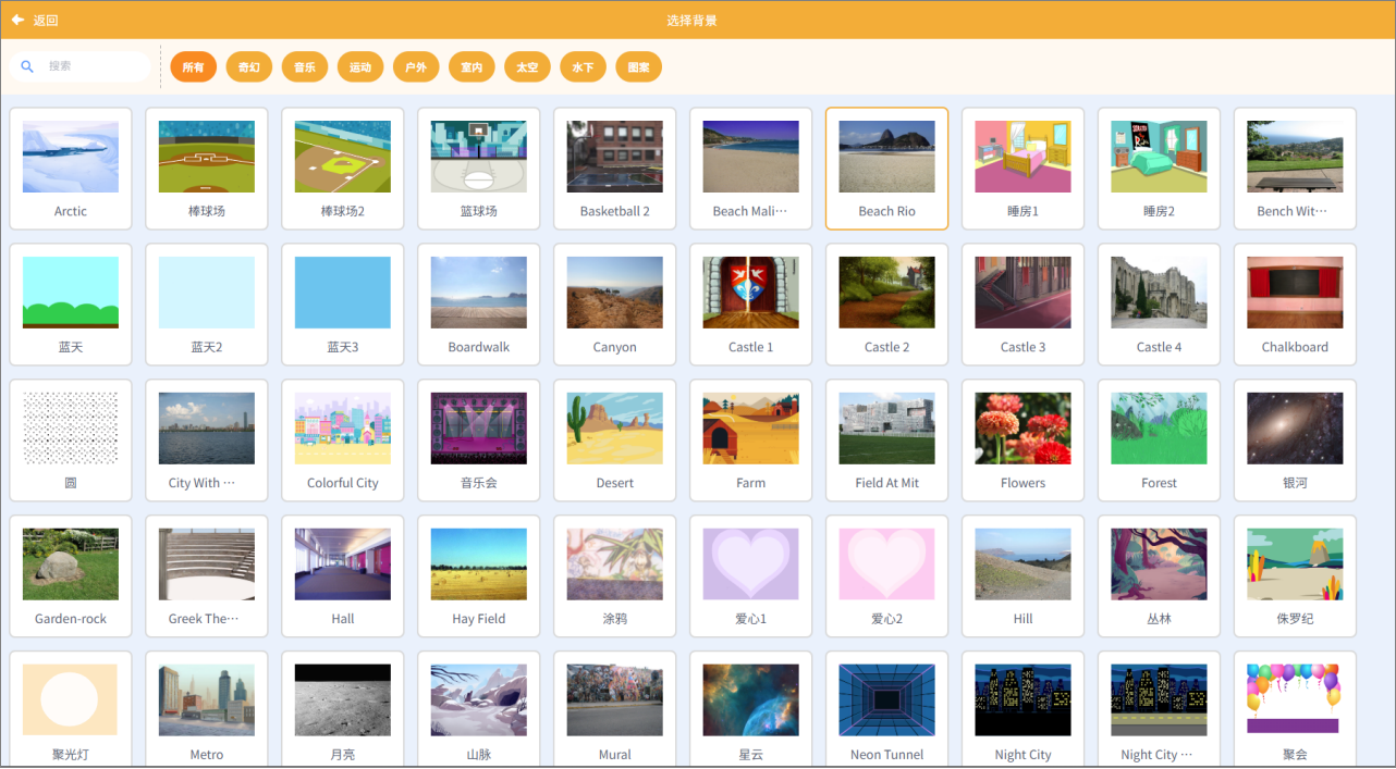| 背景列表 | 展示当前舞台背景,与角色类似,背景也可进行独立程序编写(背景程序)。 |