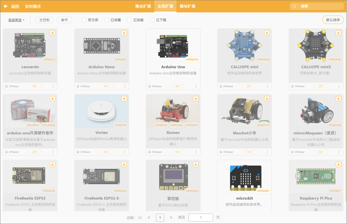 在实时模式中选择“积木扩展”并进入“主控扩展”栏目后,用户可以加载各类主控板(硬件控制板)的专属指令积木。加载后,舞台编程区将新增对应主控的硬件控制积木,使用户能够实现与现实世界设备的互动控制。