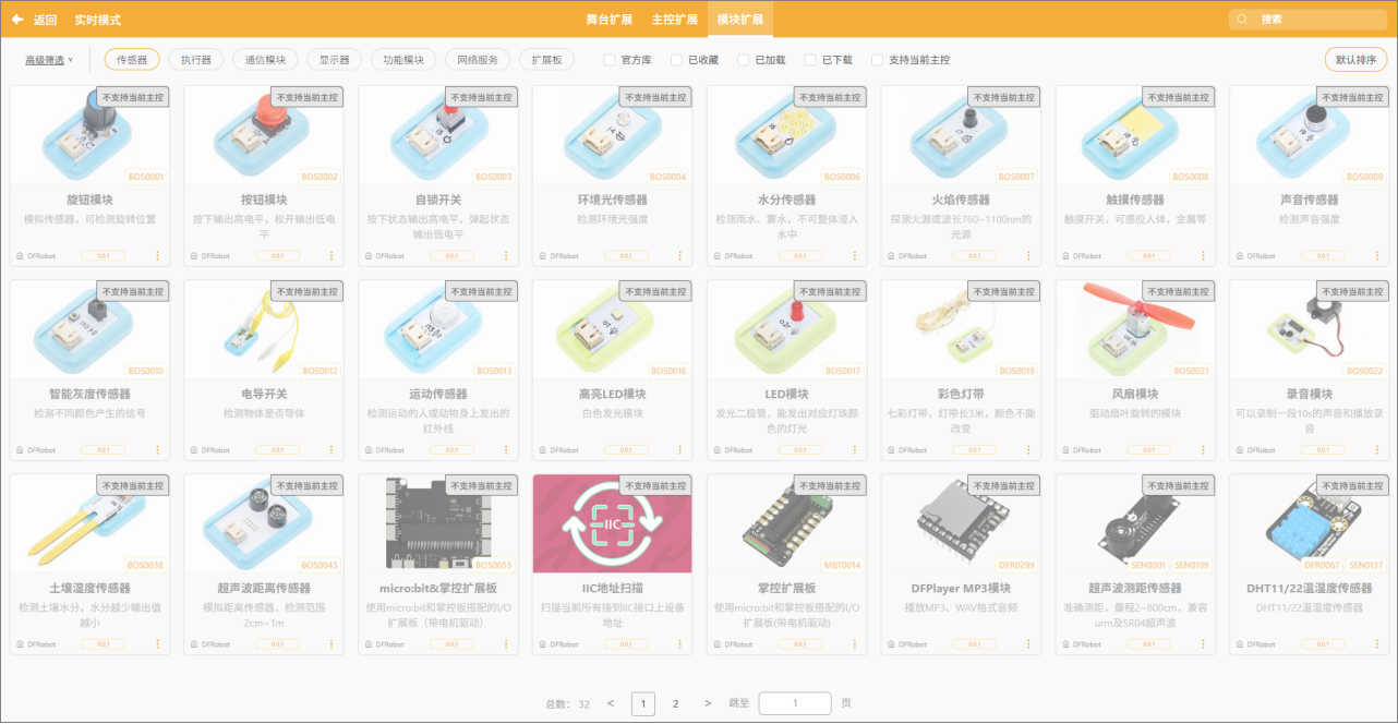 当用户在实时模式中已经选择了某一主控板(如 micro:bit、Arduino、掌控板等)后,系统会对“模块扩展”栏目进行筛选,仅显示与该主控可兼容的传感器模块、执行模块及功能扩展板。通过加载对应模块扩展,用户可在编程区获得该模块的专属控制积木,用于实现传感器数据读取、输入响应、动作执行等功能。