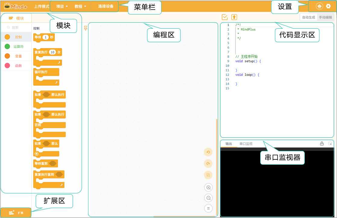整个界面可分为7个区域:菜单栏、设置、模块、扩展区、编程区、代码显示区、串口监视器。