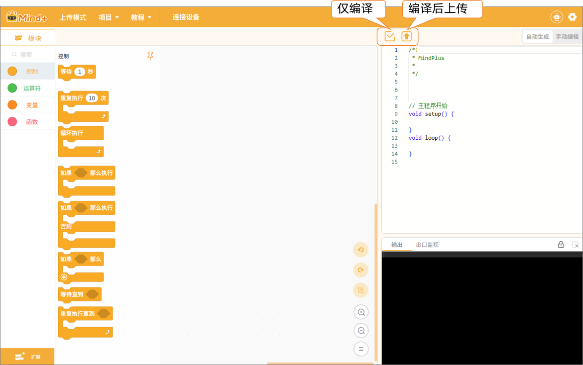在认识上传界面之前,我们需要先了解两个非常重要的按钮——“仅编译” 和 “编译后上传”。它们位于代码显示区的左上角,用于控制程序的编译与上传流程,是程序执行前的关键步骤。