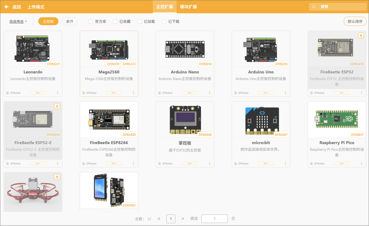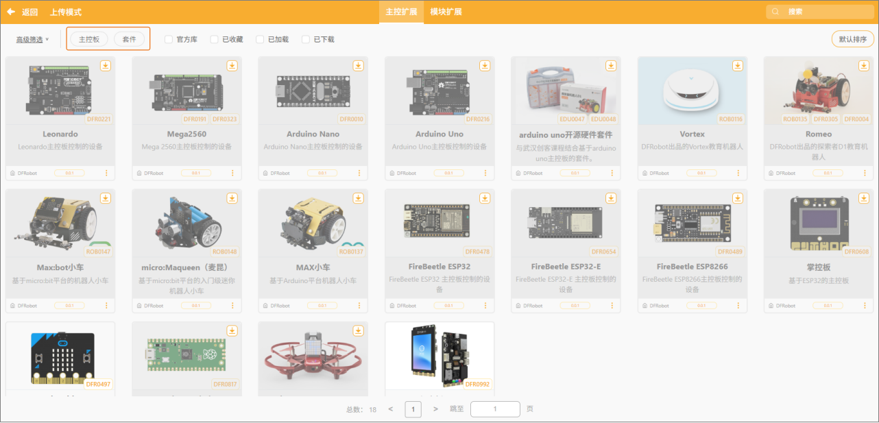 主控扩展是系统识别和控制硬件的核心部分,加载后可驱动对应主控板及其套件。主控扩展进一步分为:主控板和套件。