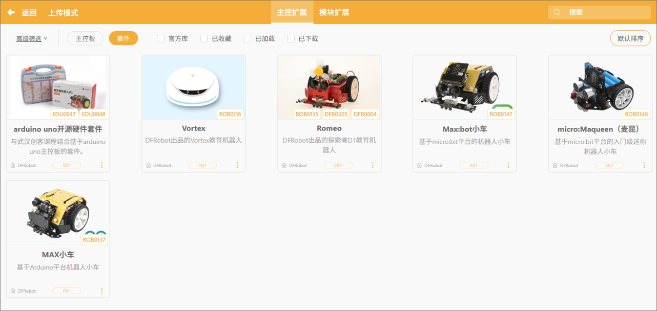 套件:套件是与主控板配套的传感器、执行模块或配件组合,扩展主控板功能,让创意项目更丰富。上传模式中,支持6种不同的套件。
