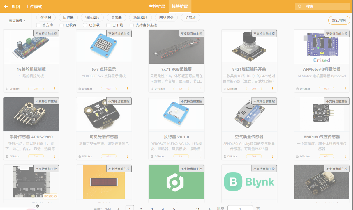 模块扩展是在选择好主控板后自动匹配显示的功能区域,系统会根据该主控支持的硬件列出可用模块,用户可根据项目需求手动选择添加。这些模块可用于增强项目功能,实现更丰富的交互与控制。