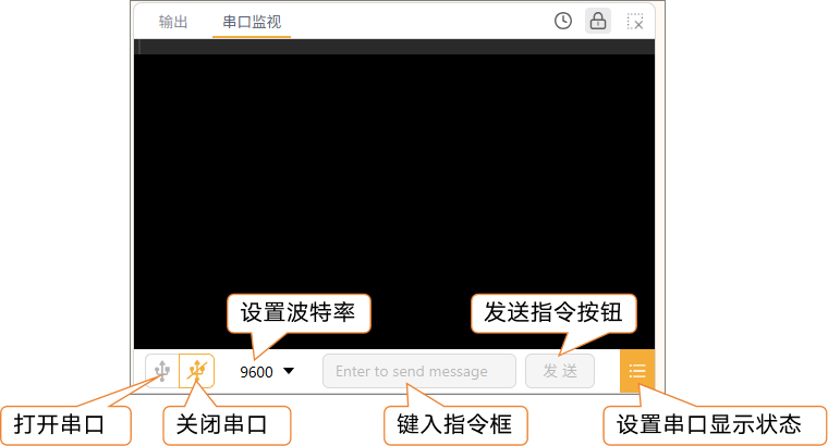 3.2.7 串口监视器 串口监视器是用来查看程序运行信息的重要工具,主要包含以下两个功能:输出、串口监视。 1. 输出¶ 用于显示程序在“编译”和“上传”过程中的系统提示信息,例如编译是否成功、上传进度是否正常等,便于用户快速判断程序是否顺利烧录到主控板。 2. 串口监视¶ 用于查看主控板在程序运行过程中通过串口发送的数据。用户可以通过在程序中加入串口打印指令,将变量值、传感器数据或运行状态输出到该窗口,实现程序调试与数据观察。