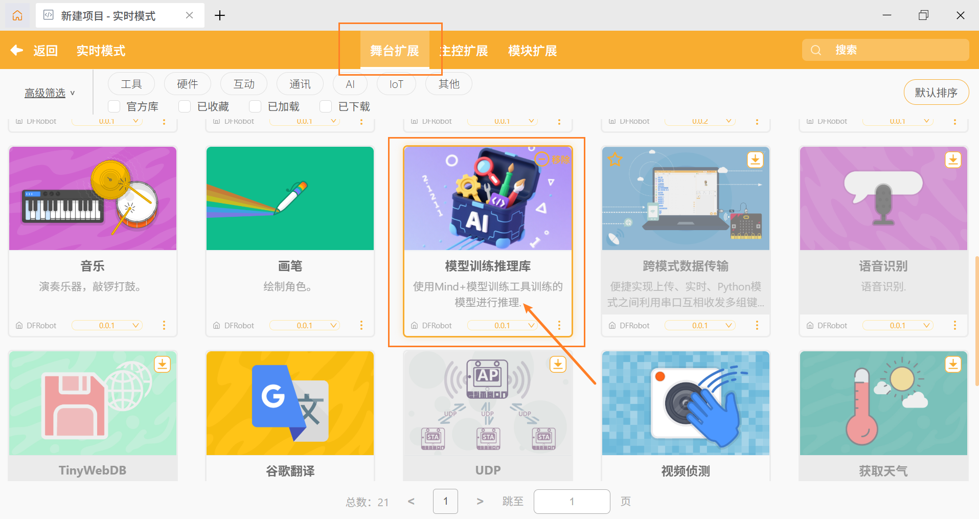 在实时模式下,点击左下角’扩展‘,在舞台扩展中找到 '模型训练推理库' ,点击加载。