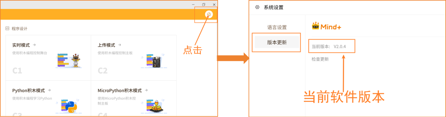 | A | 打开Mind+编程软件,点击右上角系统设置图标。 V2.0.4及以上版本的Mind+ 的系统设置面板中新增一栏 ' 版本更新 ',点击' 版本更新 ',可以查看当前Mind+软件版本。![]() |