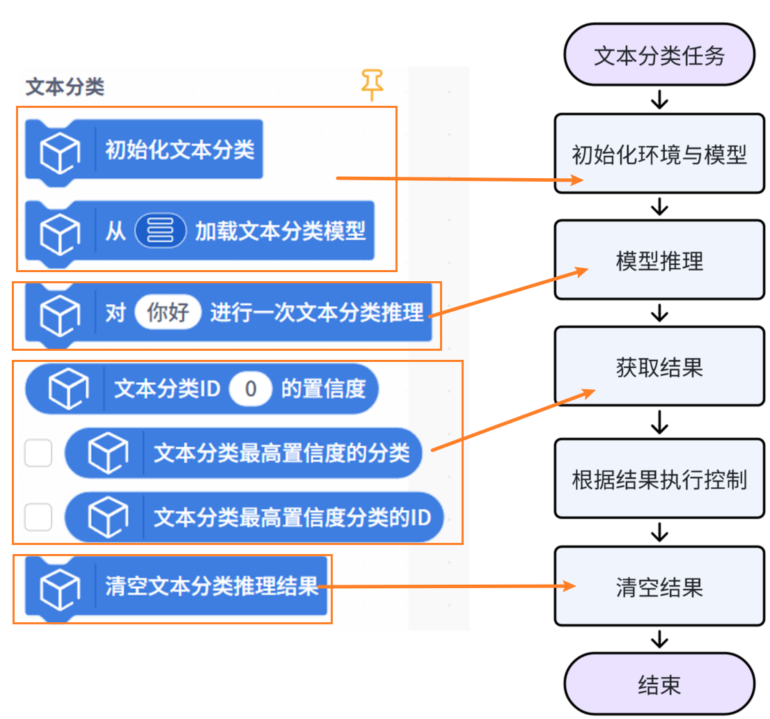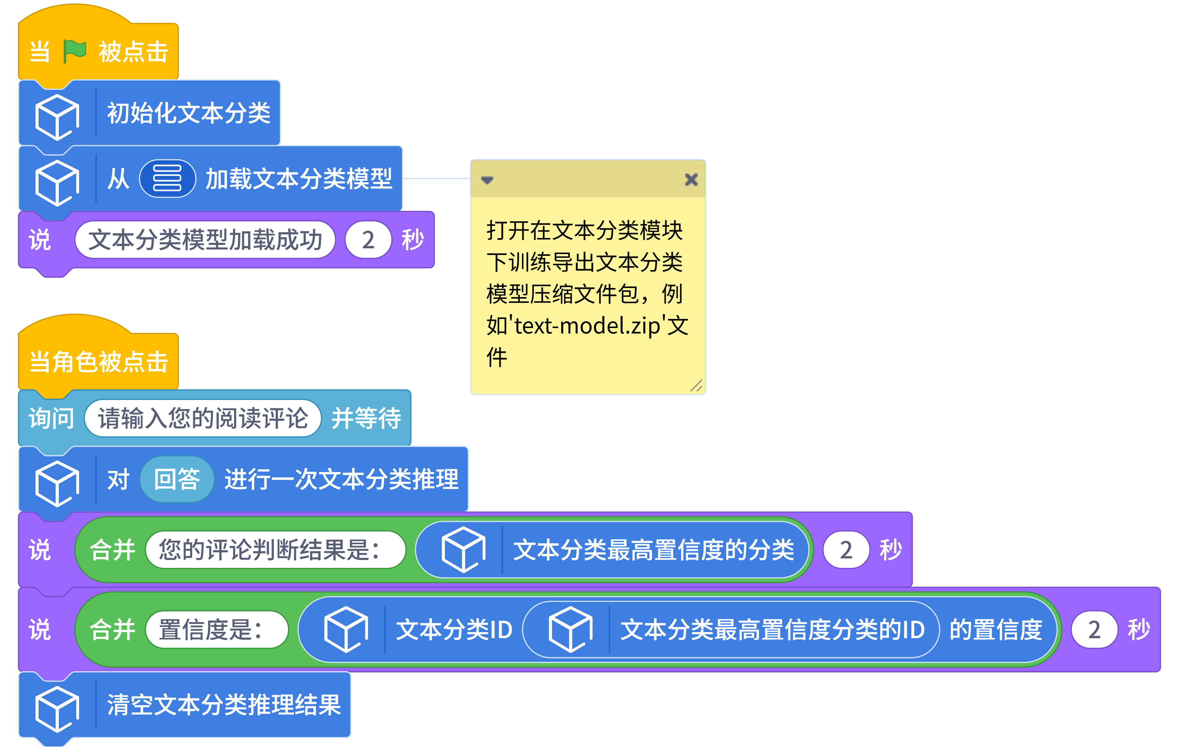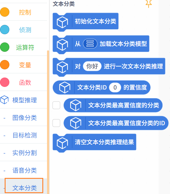 加载成功后,返回实时模式编程页面,点击 '模型推理' 下的 '文本分类' ,可以找到文本分类积木块,如下所示。
